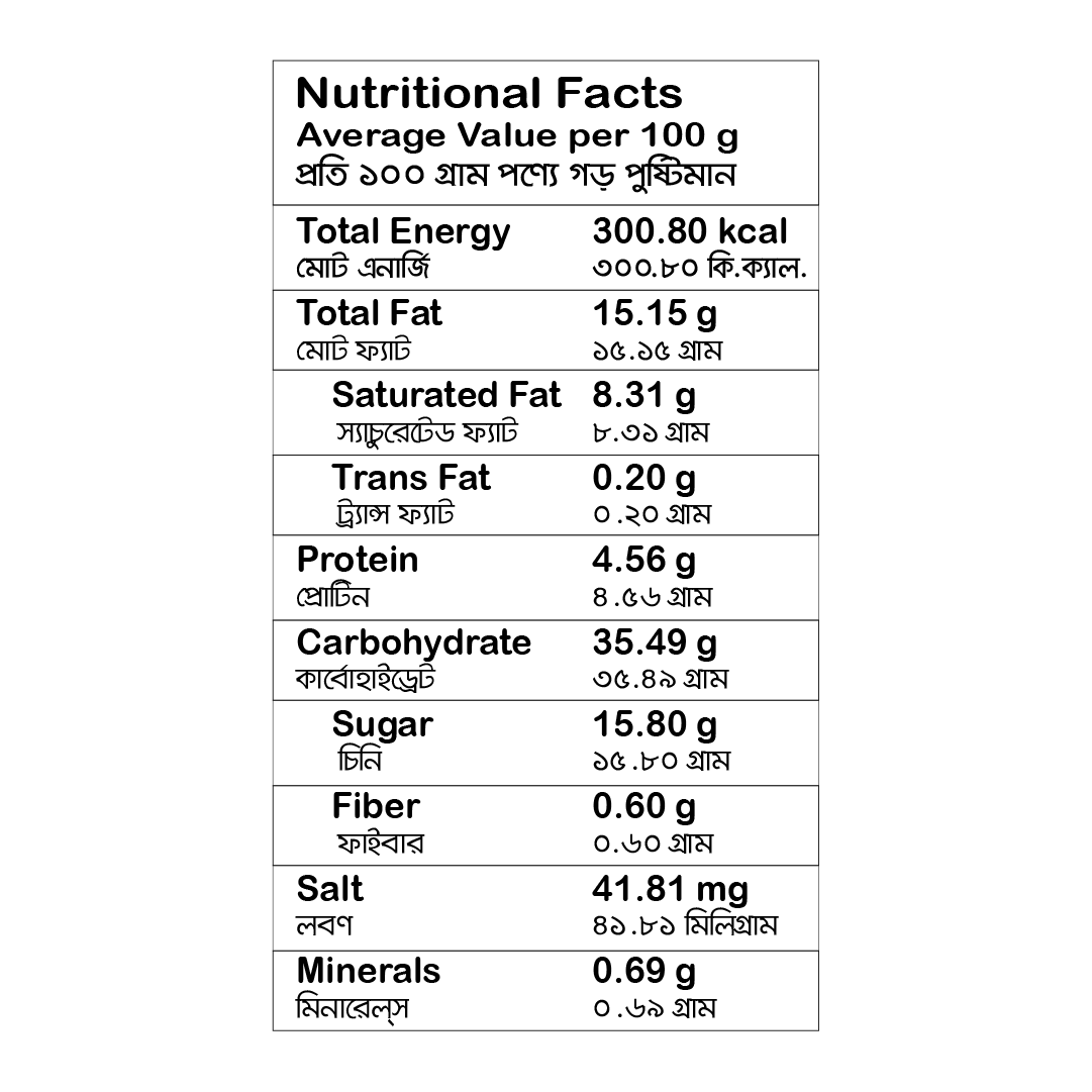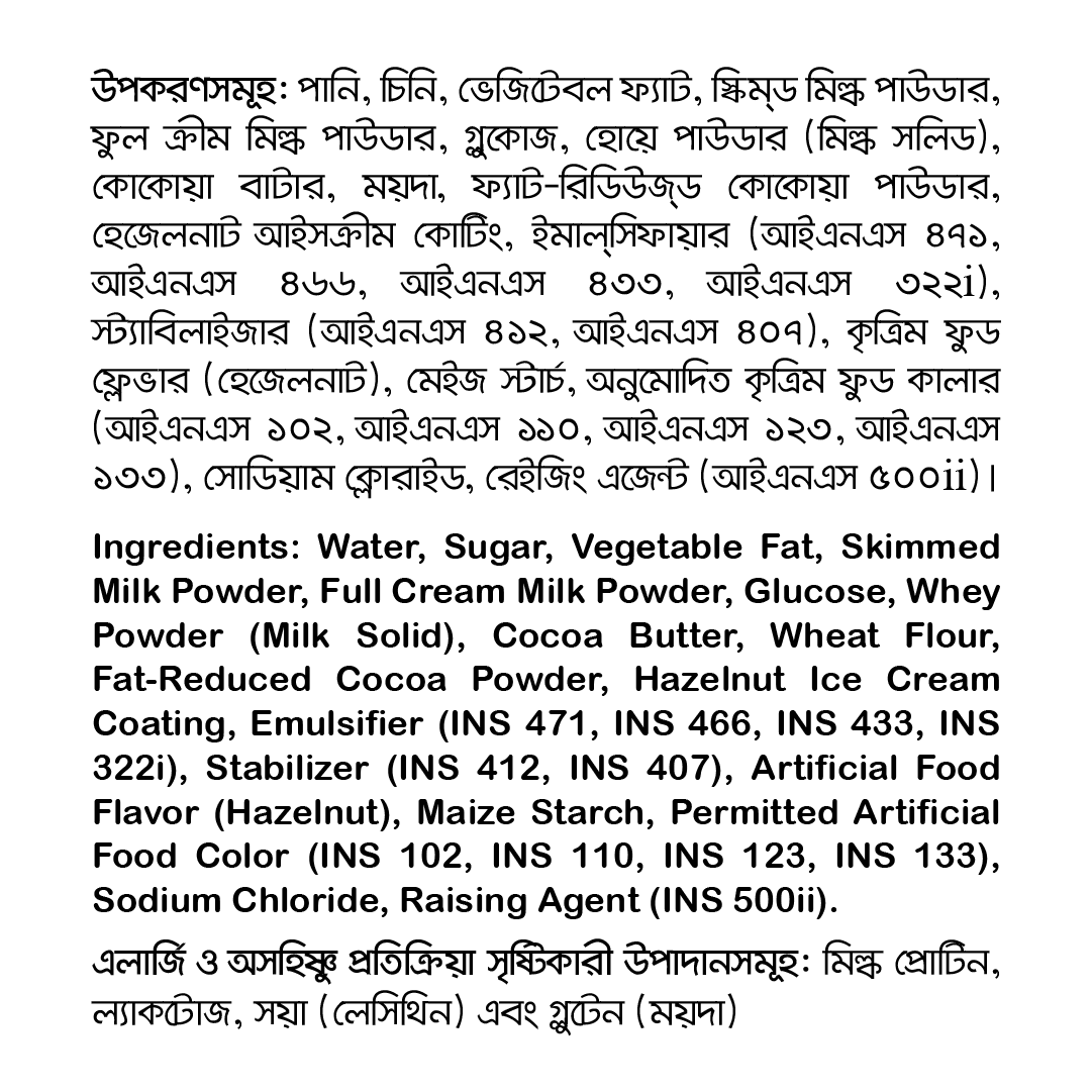 পানি, চিনি, ভেজিটেবল ফ্যাট, স্কিড মিল্ক পাউডার, ফুল ক্রীম মিল্ক পাউডার, গ্লুকোজ, হোয়ে পাউডার (মিল্ক সলিড), কোকোয়া বাটার, ময়দা, ফ্যাট-রিডিউড কোকোয়া পাউডার, হেজেলনাট আইসক্রীম কোটিং, ইমালসিফায়ার (আইএনএস ৪৭১, আইএনএস ৪৬৬, আইএনএস ৪৩৩, আইএনএস ৩২২i), স্ট্যাবিলাইজার (আইএনএস ৪১২, দআইএনএস ৪০৭), কৃত্রিম ফুড ফ্লেভার (হেজেলনাট), মেইজ স্টার্চ, অনুমোদিত কৃত্রিম ফুড কালার (আইএনএস ১০২, আইএনএস ১১০, আইএনএস ১২৩, আইএনএস ১৩৩), সোডিয়াম ক্লোরাইড, রেইজিং এজেন্ট (আইএনএস (৫০০ii) |