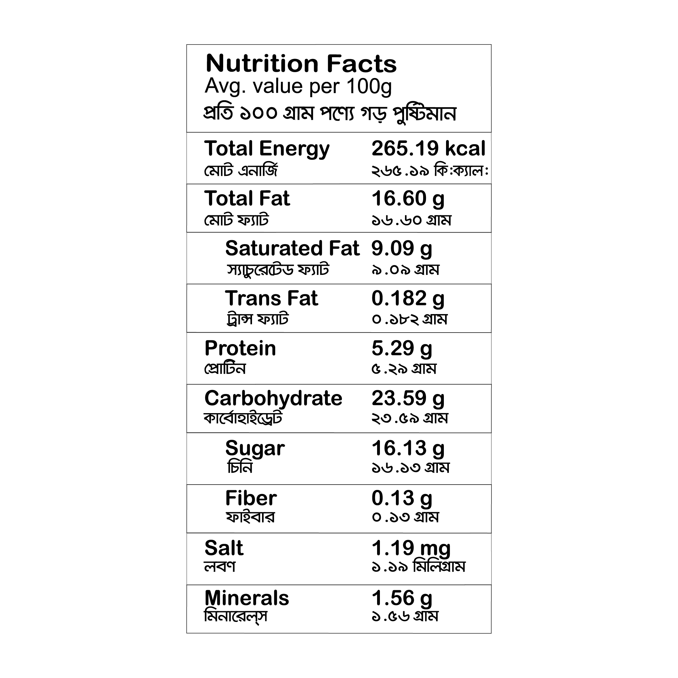 Water, Sugar, Full Cream Milk Powder, Vegetable Fat, Yoghurt, Yoghurt Powder, Glucose, Chana Powder, Emulsifiers (INS 471, INS 466, INS 433), Stabilizers (INS 412, INS 407), Natural and Artificial Mixed Food Flavor (Yoghurt), and Permitted Artificial Food Colors (INS 102, INS 110, INS 123, INS 133).